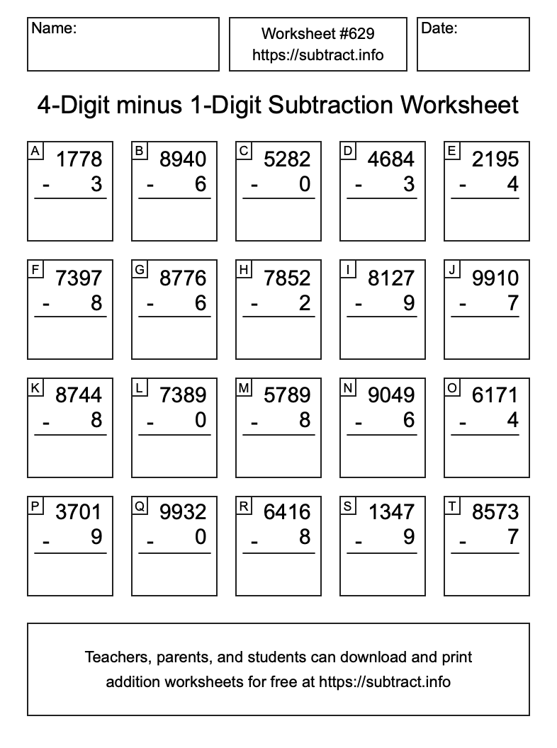 Here is the 4-Digit minus 1-Digit Subtraction Worksheet #629. Print and/or save the worksheet using the buttons below the image. You can also drag or right-click on the image to download it to your device.