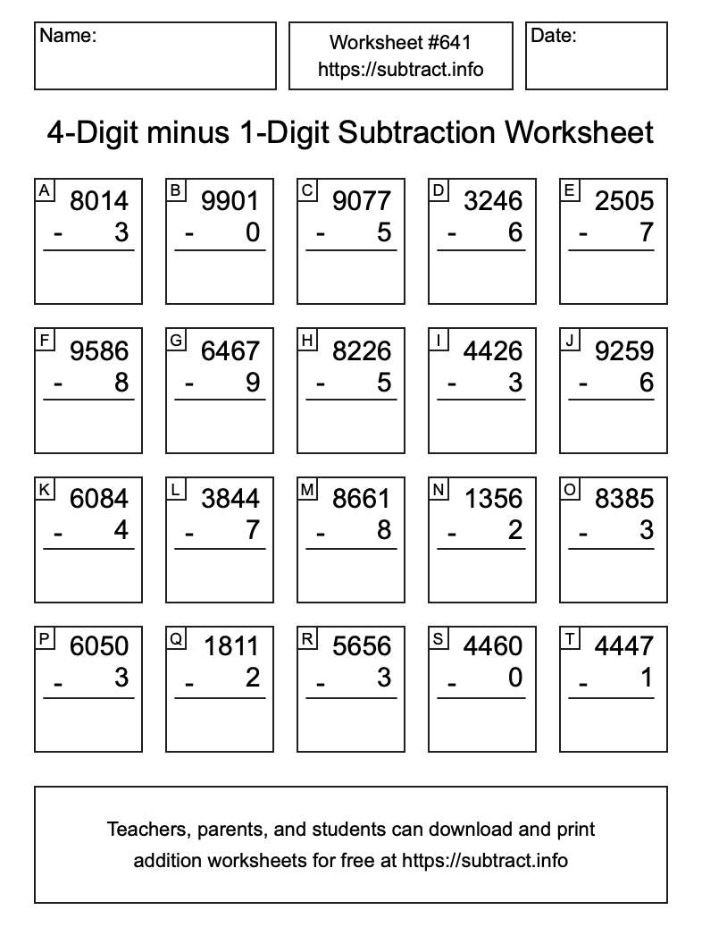 Here is the 4-Digit minus 1-Digit Subtraction Worksheet #641. Print and/or save the worksheet using the buttons below the image. You can also drag or right-click on the image to download it to your device.