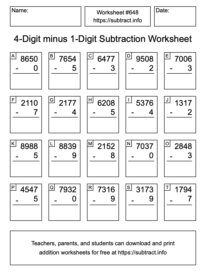 Here is the 4-Digit minus 1-Digit Subtraction Worksheet #648. Print and/or save the worksheet using the buttons below the image. You can also drag or right-click on the image to download it to your device.