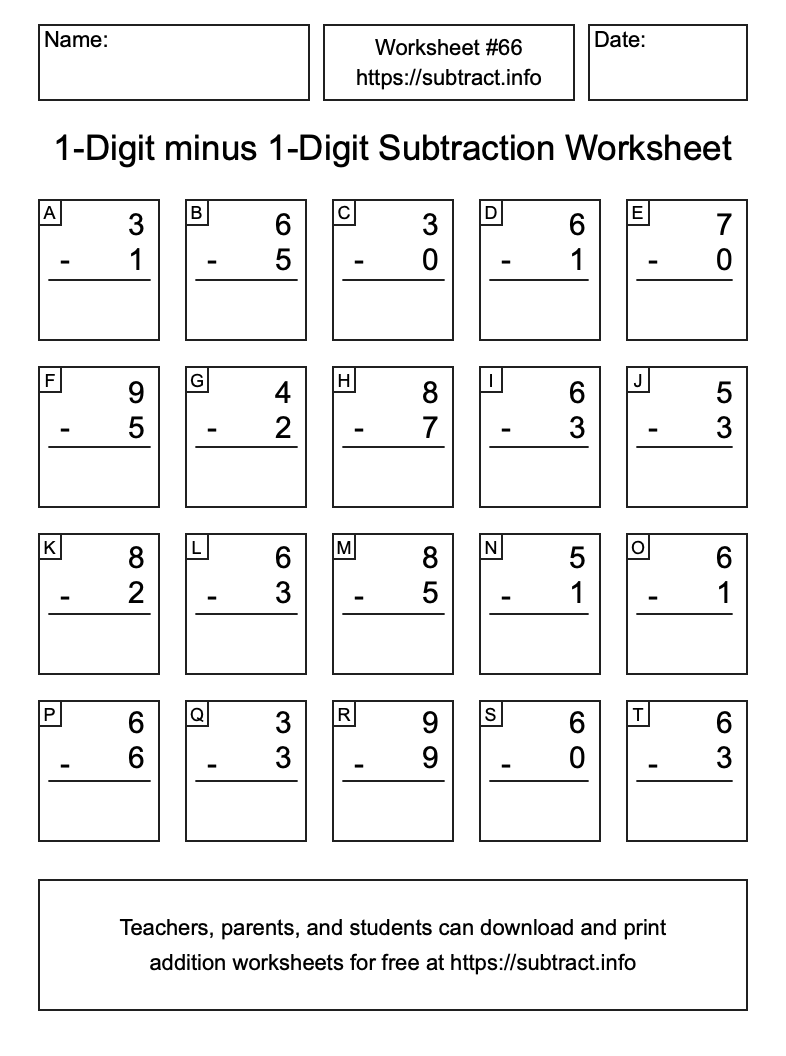 Here is the 1-Digit minus 1-Digit Subtraction Worksheet #66. Print and/or save the worksheet using the buttons below the image. You can also drag or right-click on the image to download it to your device.