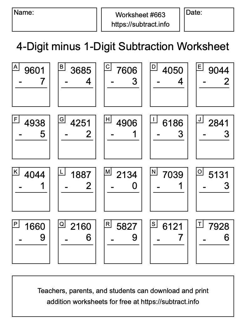 Here is the 4-Digit minus 1-Digit Subtraction Worksheet #663. Print and/or save the worksheet using the buttons below the image. You can also drag or right-click on the image to download it to your device.