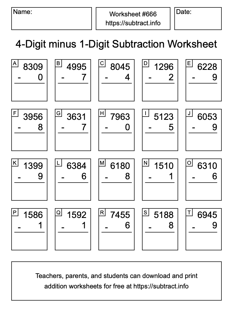 Here is the 4-Digit minus 1-Digit Subtraction Worksheet #666. Print and/or save the worksheet using the buttons below the image. You can also drag or right-click on the image to download it to your device.