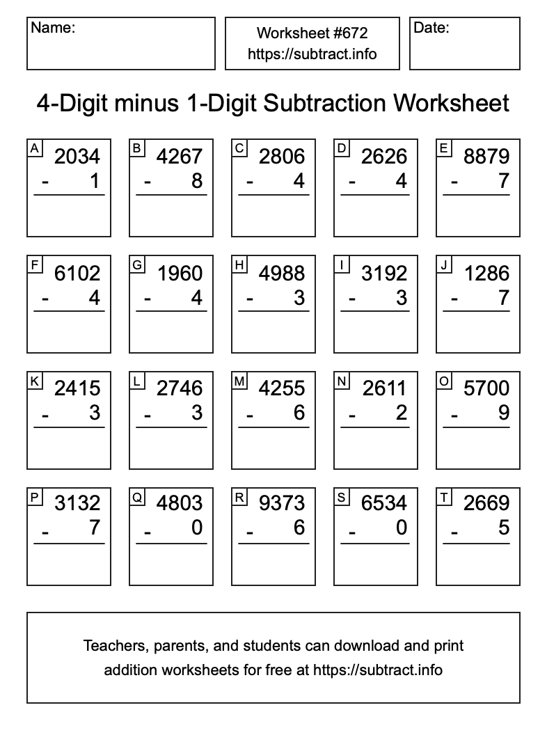 Here is the 4-Digit minus 1-Digit Subtraction Worksheet #672. Print and/or save the worksheet using the buttons below the image. You can also drag or right-click on the image to download it to your device.