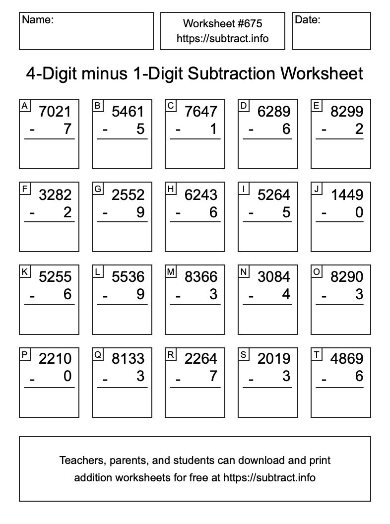 Here is the 4-Digit minus 1-Digit Subtraction Worksheet #675. Print and/or save the worksheet using the buttons below the image. You can also drag or right-click on the image to download it to your device.