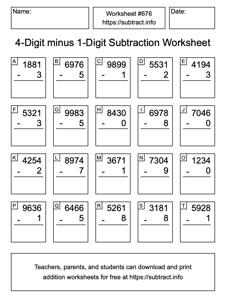 Here is the 4-Digit minus 1-Digit Subtraction Worksheet #676. Print and/or save the worksheet using the buttons below the image. You can also drag or right-click on the image to download it to your device.