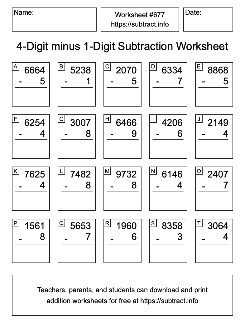 Here is the 4-Digit minus 1-Digit Subtraction Worksheet #677. Print and/or save the worksheet using the buttons below the image. You can also drag or right-click on the image to download it to your device.