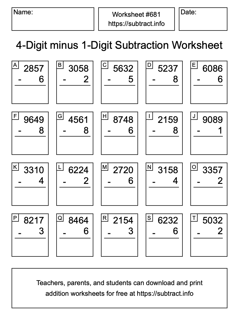 Here is the 4-Digit minus 1-Digit Subtraction Worksheet #681. Print and/or save the worksheet using the buttons below the image. You can also drag or right-click on the image to download it to your device.
