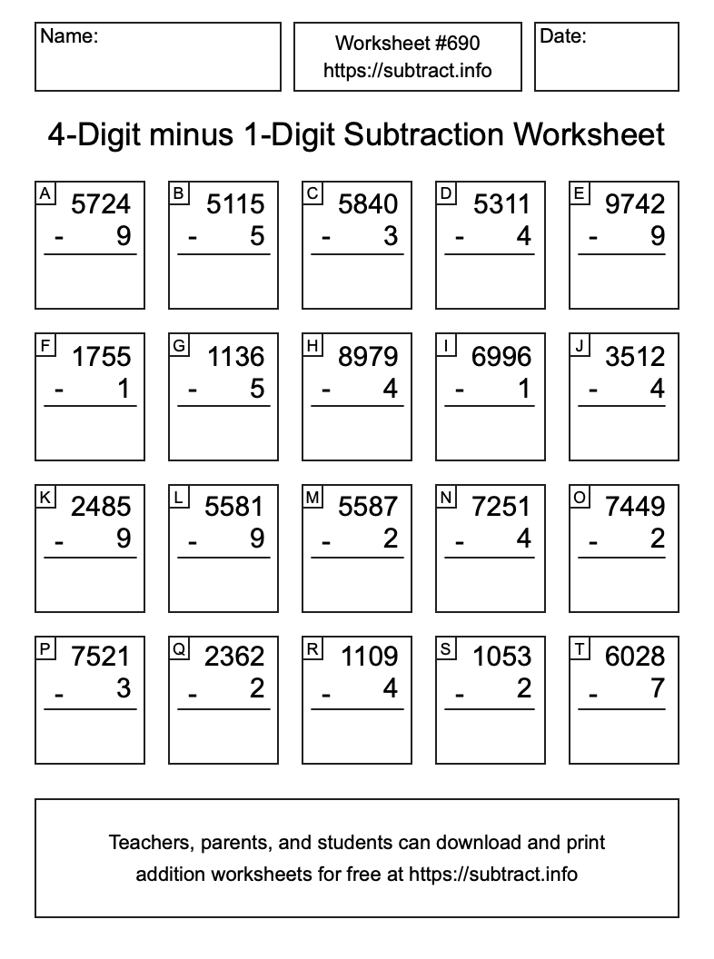 Here is the 4-Digit minus 1-Digit Subtraction Worksheet #690. Print and/or save the worksheet using the buttons below the image. You can also drag or right-click on the image to download it to your device.