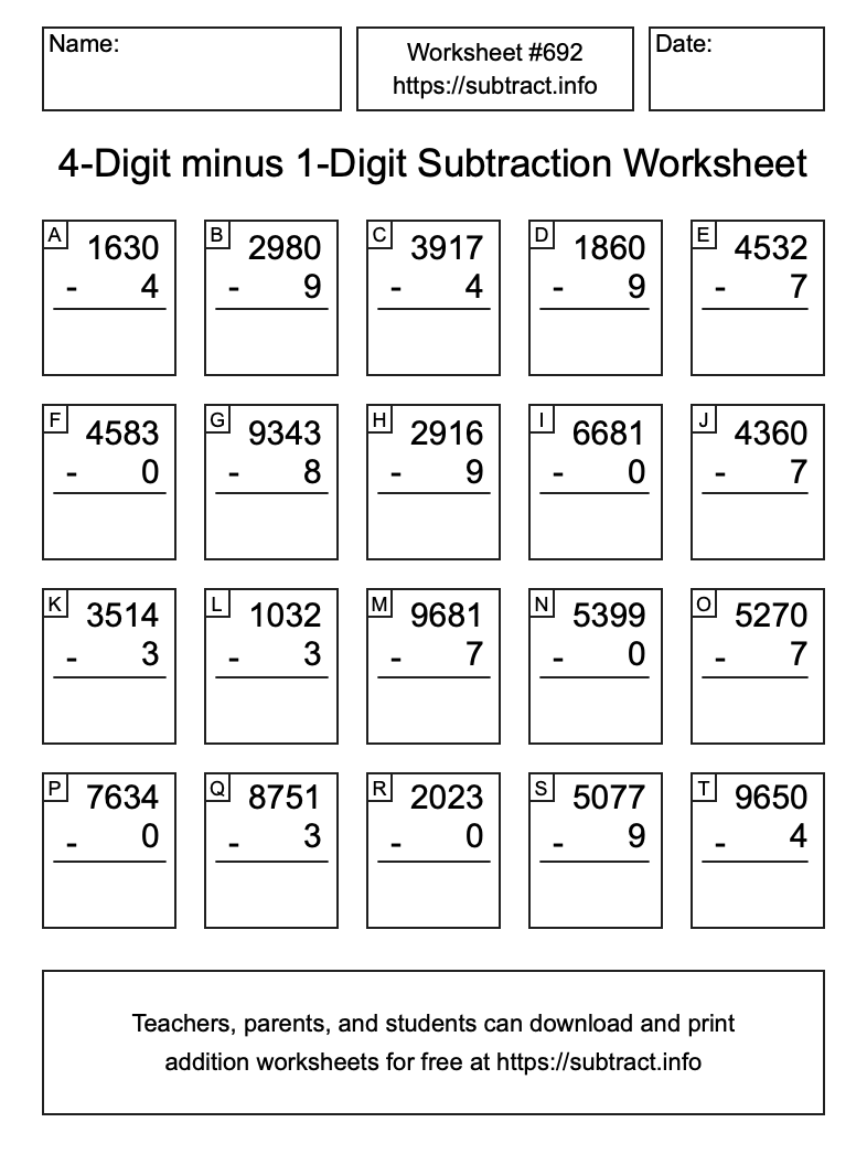 Here is the 4-Digit minus 1-Digit Subtraction Worksheet #692. Print and/or save the worksheet using the buttons below the image. You can also drag or right-click on the image to download it to your device.