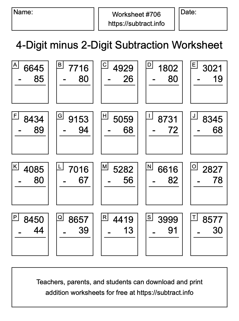 Here is the 4-Digit minus 2-Digit Subtraction Worksheet #706. Print and/or save the worksheet using the buttons below the image. You can also drag or right-click on the image to download it to your device.