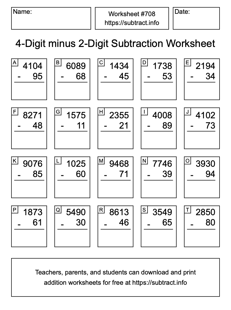 Here is the 4-Digit minus 2-Digit Subtraction Worksheet #708. Print and/or save the worksheet using the buttons below the image. You can also drag or right-click on the image to download it to your device.