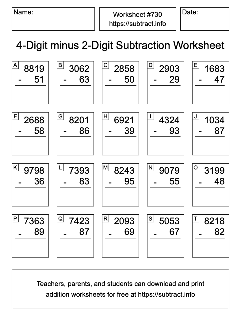 Here is the 4-Digit minus 2-Digit Subtraction Worksheet #730. Print and/or save the worksheet using the buttons below the image. You can also drag or right-click on the image to download it to your device.