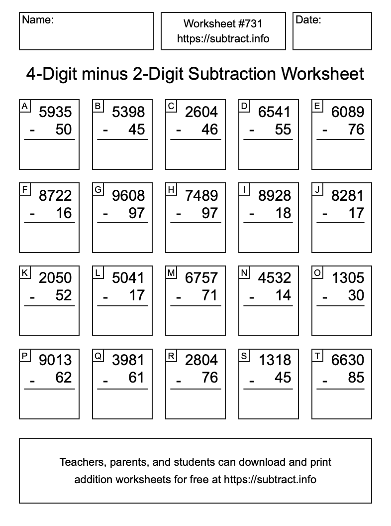 Here is the 4-Digit minus 2-Digit Subtraction Worksheet #731. Print and/or save the worksheet using the buttons below the image. You can also drag or right-click on the image to download it to your device.