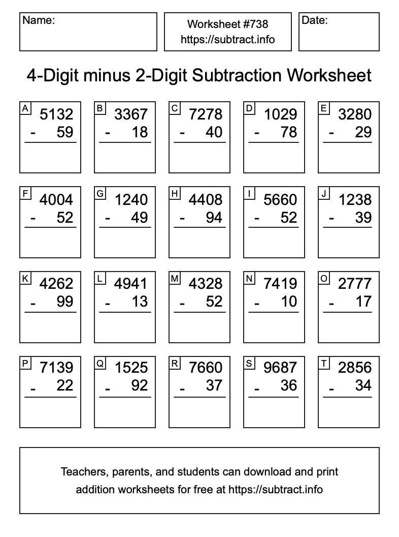 Here is the 4-Digit minus 2-Digit Subtraction Worksheet #738. Print and/or save the worksheet using the buttons below the image. You can also drag or right-click on the image to download it to your device.