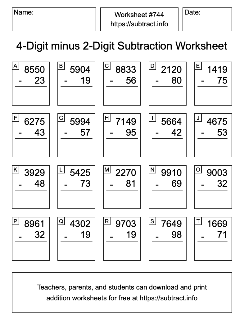 Here is the 4-Digit minus 2-Digit Subtraction Worksheet #744. Print and/or save the worksheet using the buttons below the image. You can also drag or right-click on the image to download it to your device.