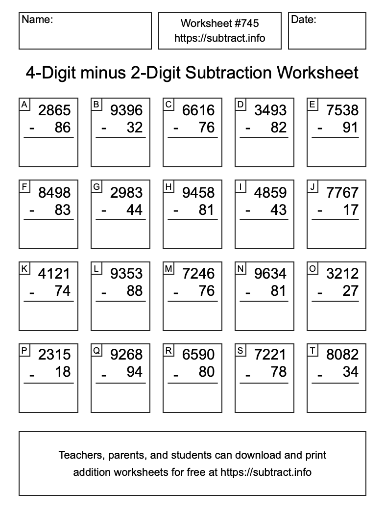 Here is the 4-Digit minus 2-Digit Subtraction Worksheet #745. Print and/or save the worksheet using the buttons below the image. You can also drag or right-click on the image to download it to your device.