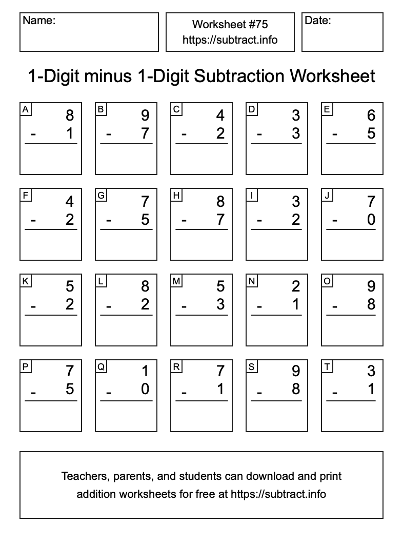 Here is the 1-Digit minus 1-Digit Subtraction Worksheet #75. Print and/or save the worksheet using the buttons below the image. You can also drag or right-click on the image to download it to your device.