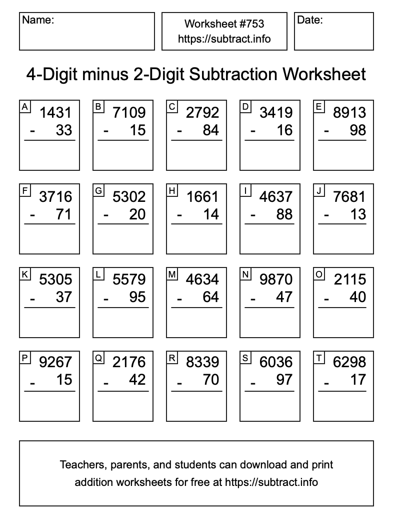 Here is the 4-Digit minus 2-Digit Subtraction Worksheet #753. Print and/or save the worksheet using the buttons below the image. You can also drag or right-click on the image to download it to your device.