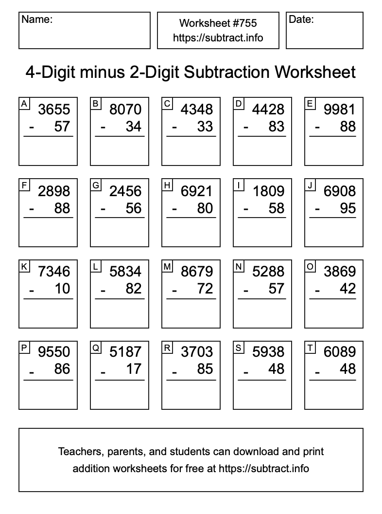 Here is the 4-Digit minus 2-Digit Subtraction Worksheet #755. Print and/or save the worksheet using the buttons below the image. You can also drag or right-click on the image to download it to your device.