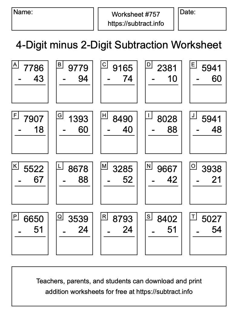 Here is the 4-Digit minus 2-Digit Subtraction Worksheet #757. Print and/or save the worksheet using the buttons below the image. You can also drag or right-click on the image to download it to your device.