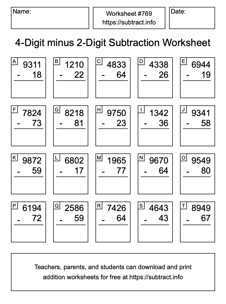 Here is the 4-Digit minus 2-Digit Subtraction Worksheet #769. Print and/or save the worksheet using the buttons below the image. You can also drag or right-click on the image to download it to your device.