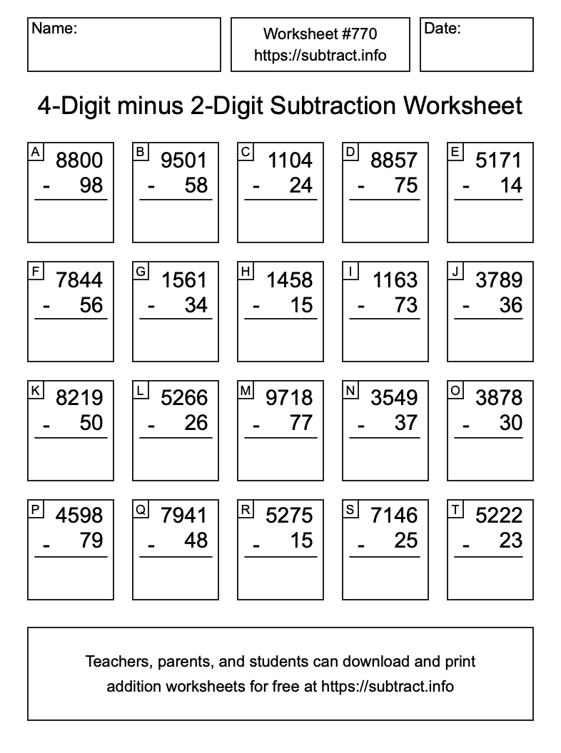 Here is the 4-Digit minus 2-Digit Subtraction Worksheet #770. Print and/or save the worksheet using the buttons below the image. You can also drag or right-click on the image to download it to your device.