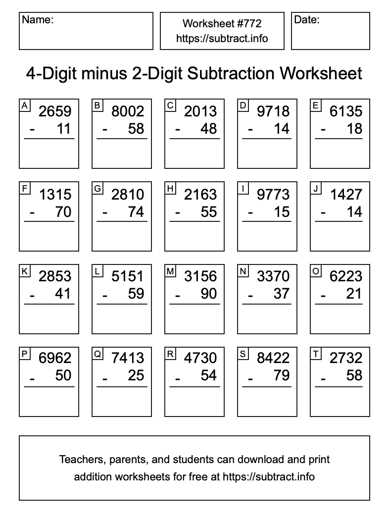 Here is the 4-Digit minus 2-Digit Subtraction Worksheet #772. Print and/or save the worksheet using the buttons below the image. You can also drag or right-click on the image to download it to your device.