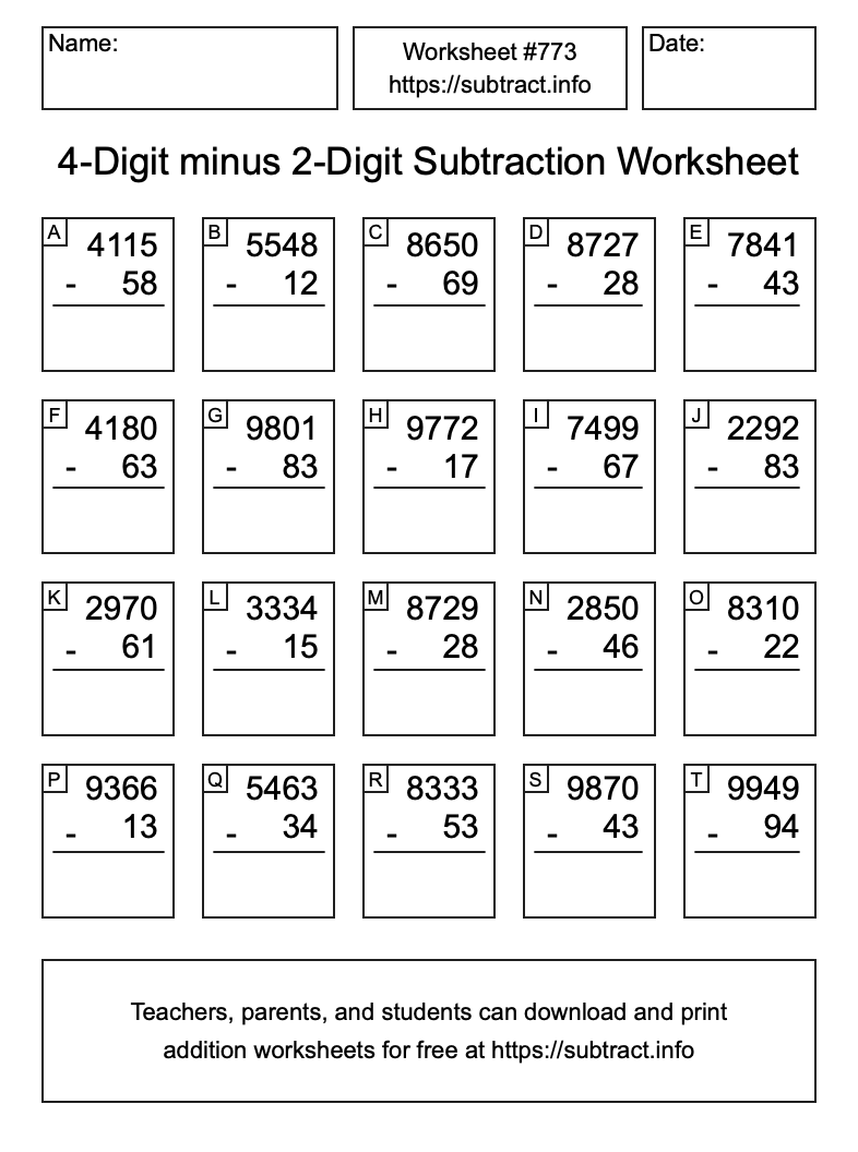 Here is the 4-Digit minus 2-Digit Subtraction Worksheet #773. Print and/or save the worksheet using the buttons below the image. You can also drag or right-click on the image to download it to your device.