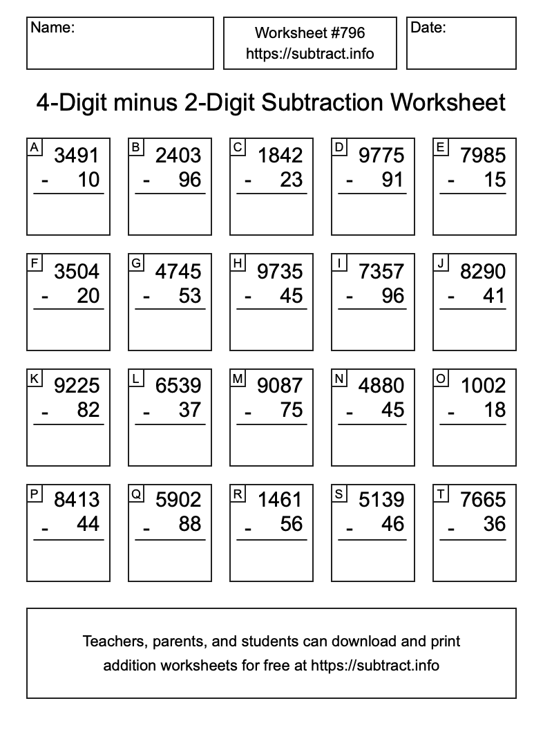 Here is the 4-Digit minus 2-Digit Subtraction Worksheet #796. Print and/or save the worksheet using the buttons below the image. You can also drag or right-click on the image to download it to your device.