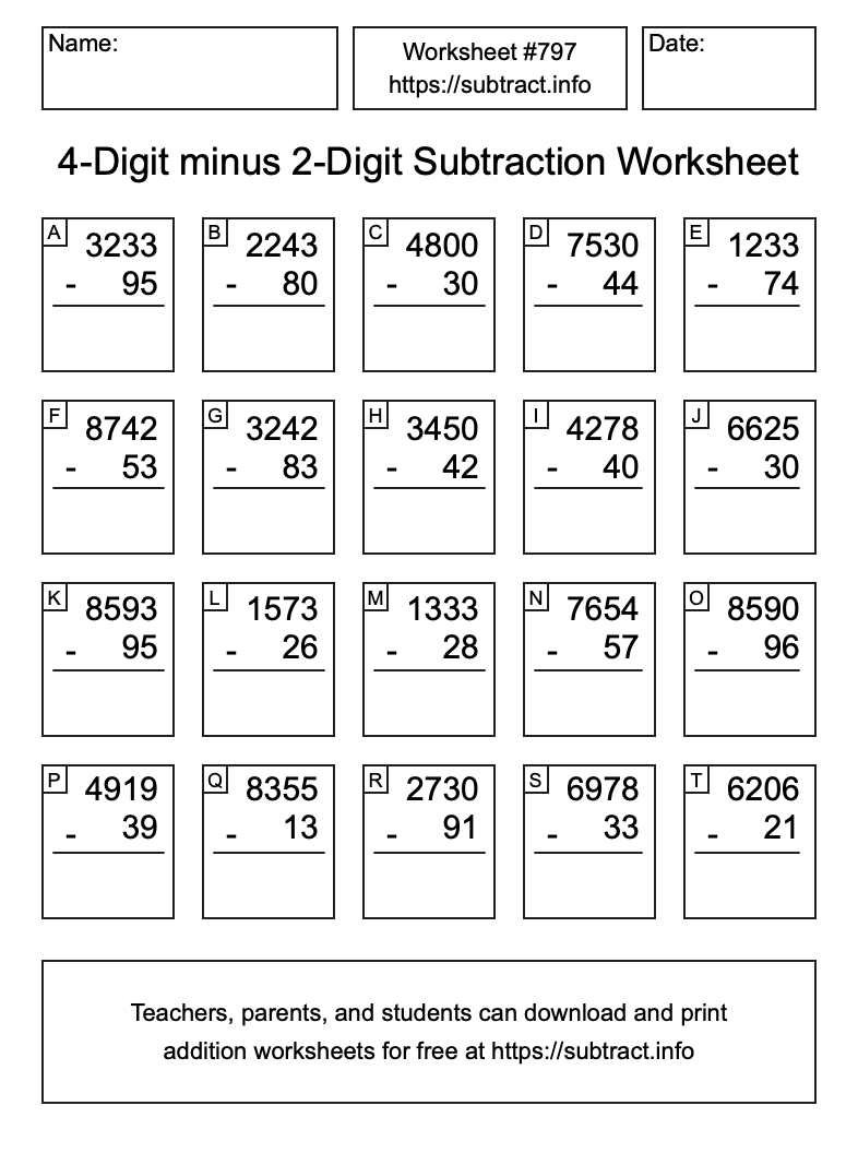 Here is the 4-Digit minus 2-Digit Subtraction Worksheet #797. Print and/or save the worksheet using the buttons below the image. You can also drag or right-click on the image to download it to your device.