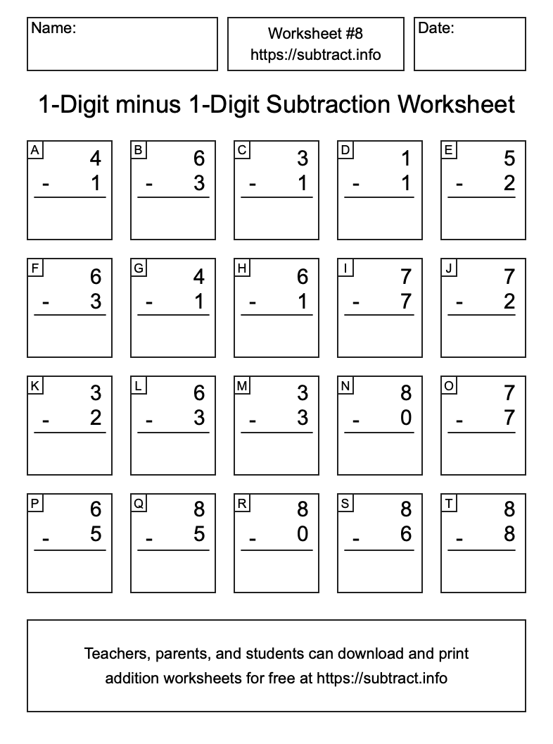 Here is the 1-Digit minus 1-Digit Subtraction Worksheet #8. Print and/or save the worksheet using the buttons below the image. You can also drag or right-click on the image to download it to your device.