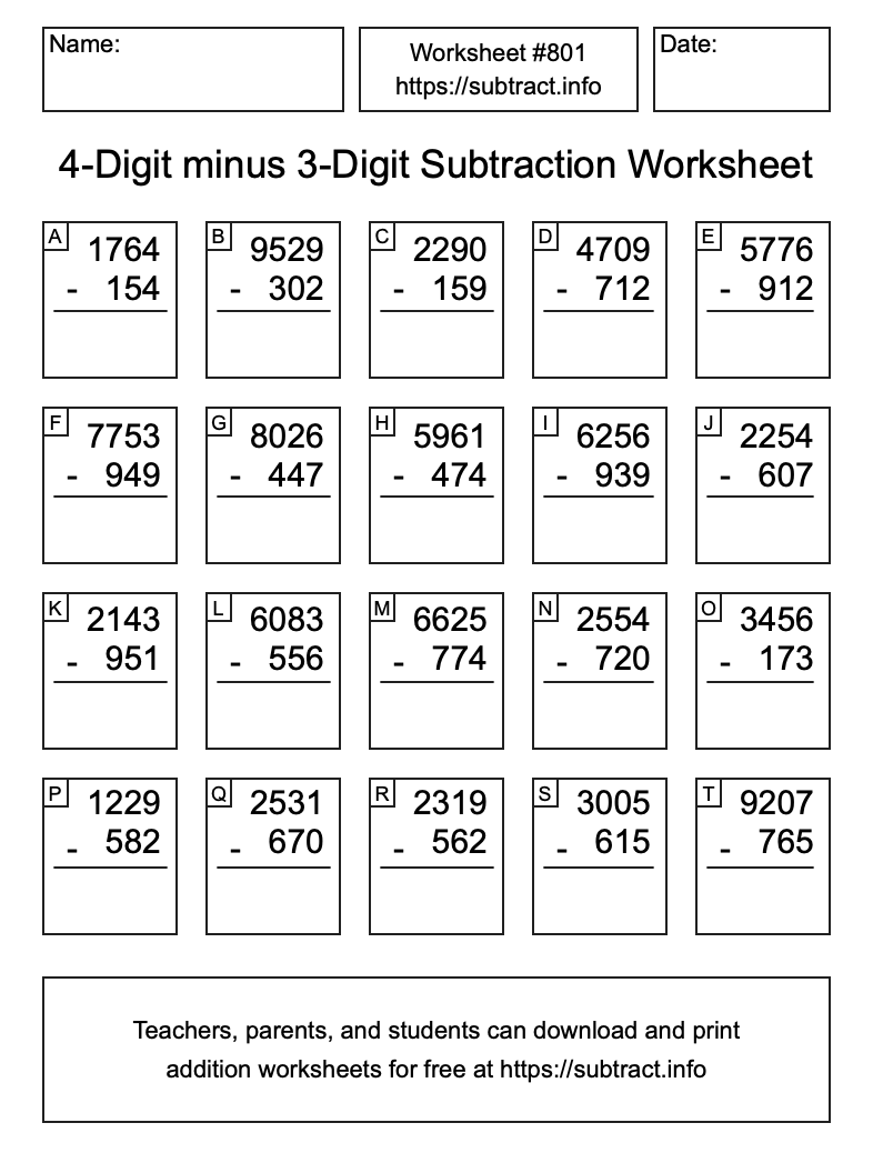 Here is the 4-Digit minus 3-Digit Subtraction Worksheet #801. Print and/or save the worksheet using the buttons below the image. You can also drag or right-click on the image to download it to your device.