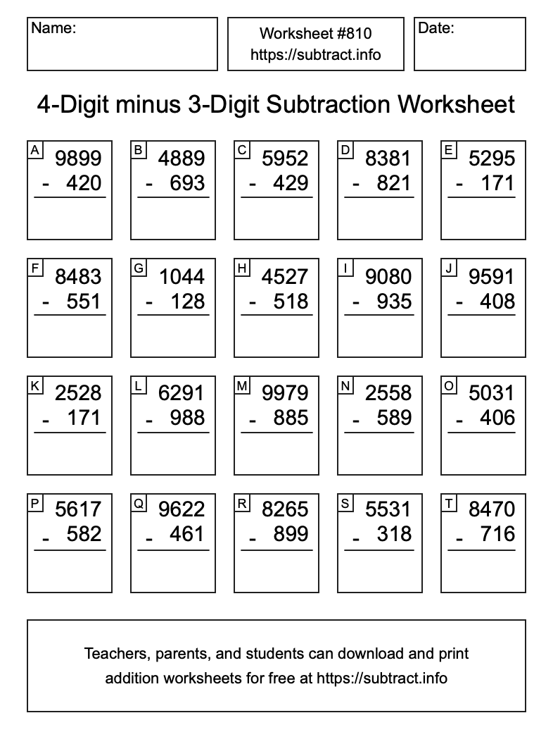 Here is the 4-Digit minus 3-Digit Subtraction Worksheet #810. Print and/or save the worksheet using the buttons below the image. You can also drag or right-click on the image to download it to your device.