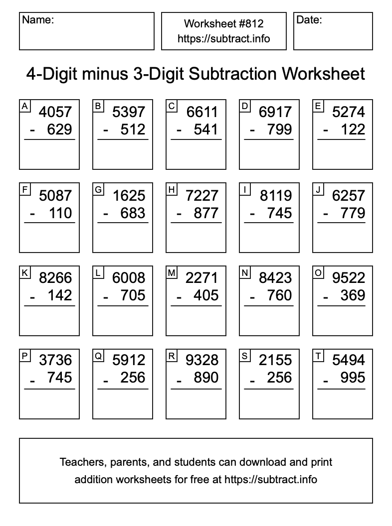 Here is the 4-Digit minus 3-Digit Subtraction Worksheet #812. Print and/or save the worksheet using the buttons below the image. You can also drag or right-click on the image to download it to your device.