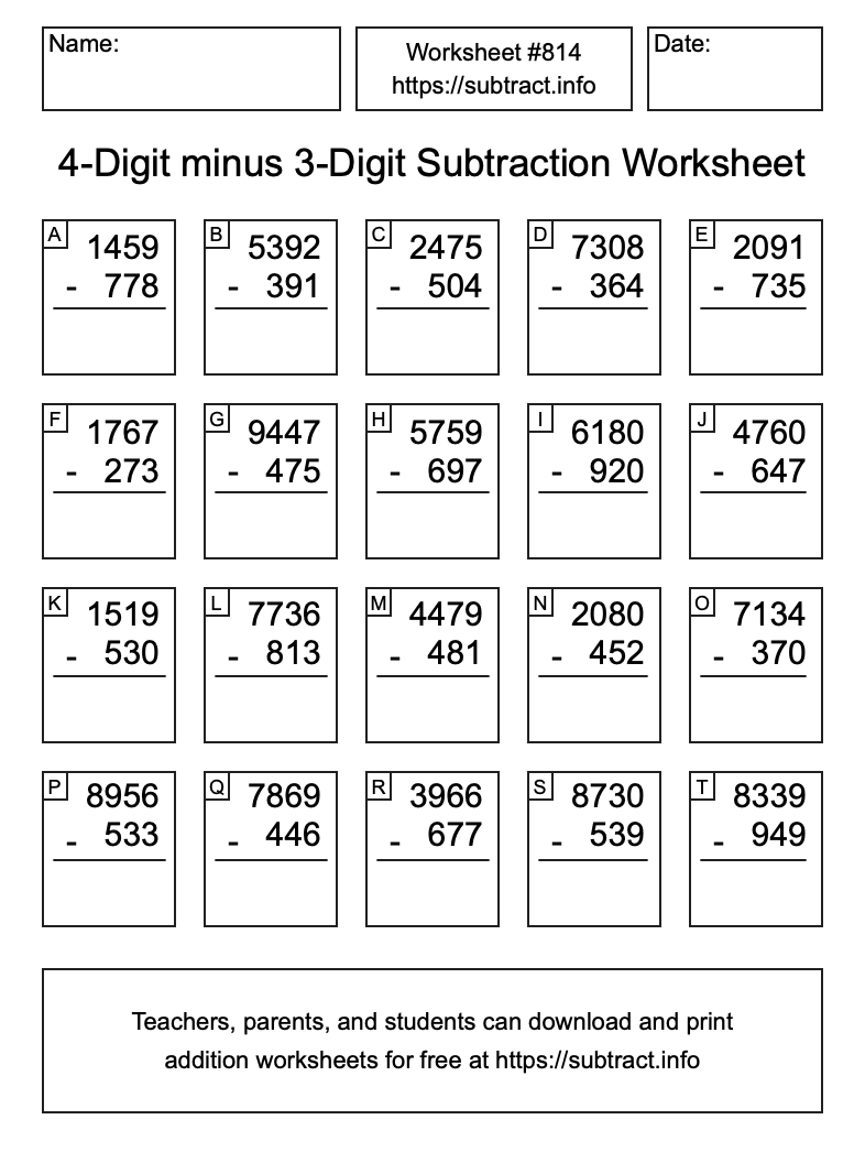 Here is the 4-Digit minus 3-Digit Subtraction Worksheet #814. Print and/or save the worksheet using the buttons below the image. You can also drag or right-click on the image to download it to your device.