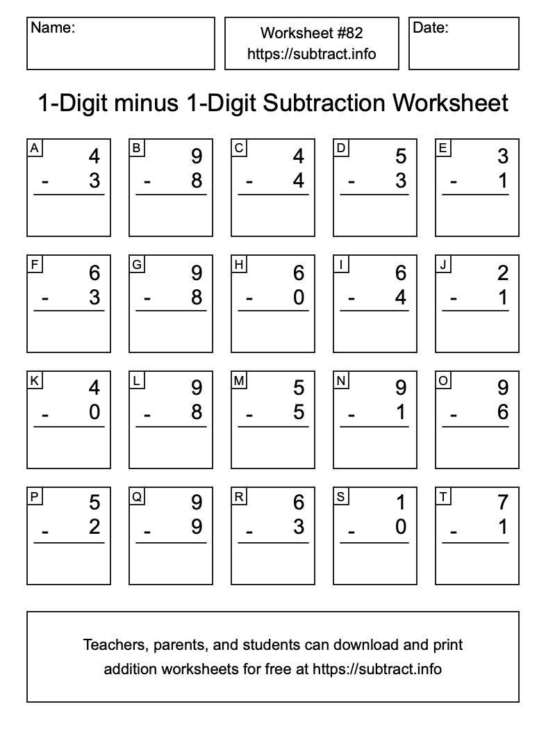 Here is the 1-Digit minus 1-Digit Subtraction Worksheet #82. Print and/or save the worksheet using the buttons below the image. You can also drag or right-click on the image to download it to your device.