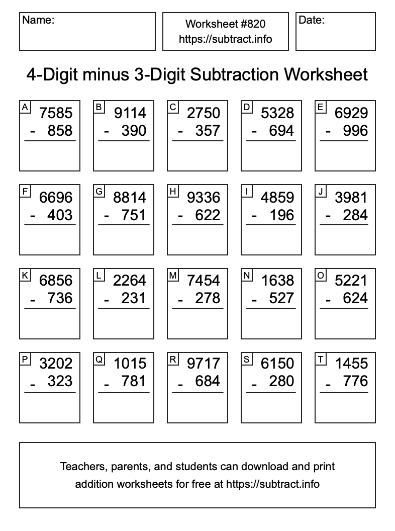 Here is the 4-Digit minus 3-Digit Subtraction Worksheet #820. Print and/or save the worksheet using the buttons below the image. You can also drag or right-click on the image to download it to your device.