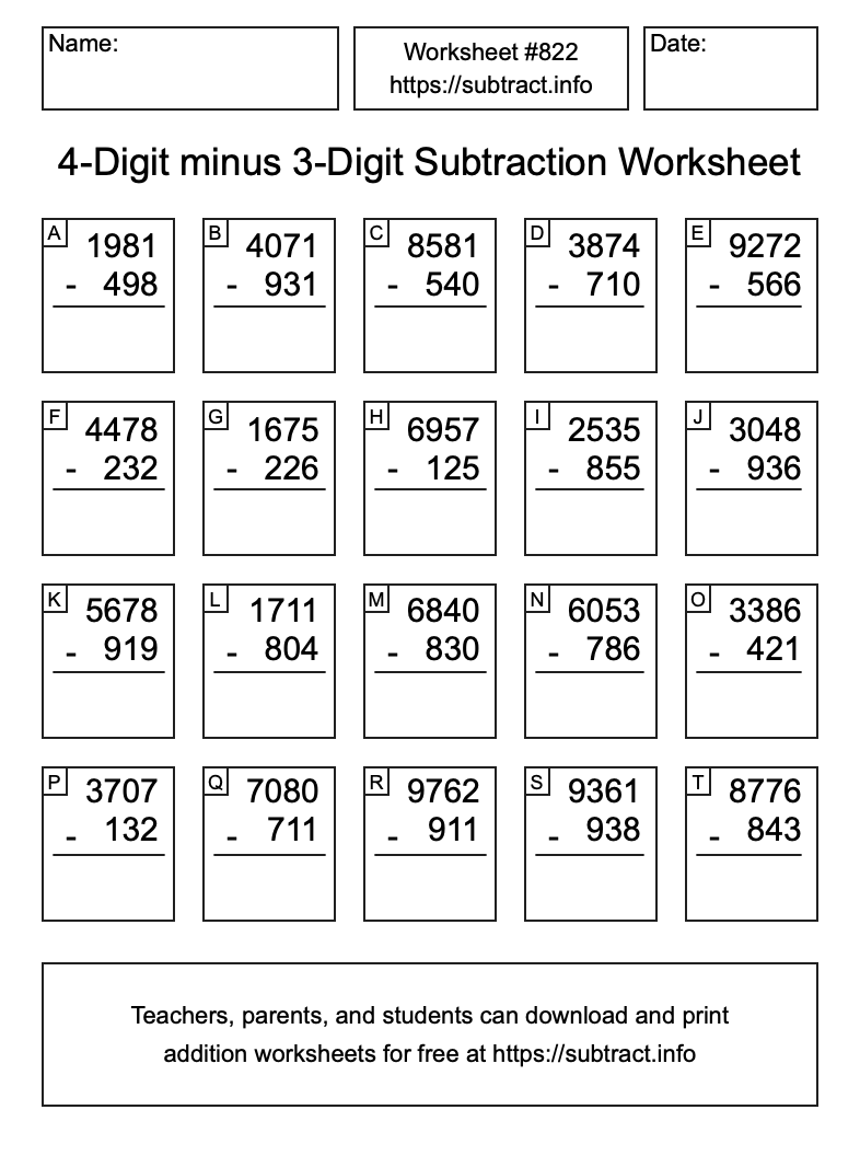 Here is the 4-Digit minus 3-Digit Subtraction Worksheet #822. Print and/or save the worksheet using the buttons below the image. You can also drag or right-click on the image to download it to your device.