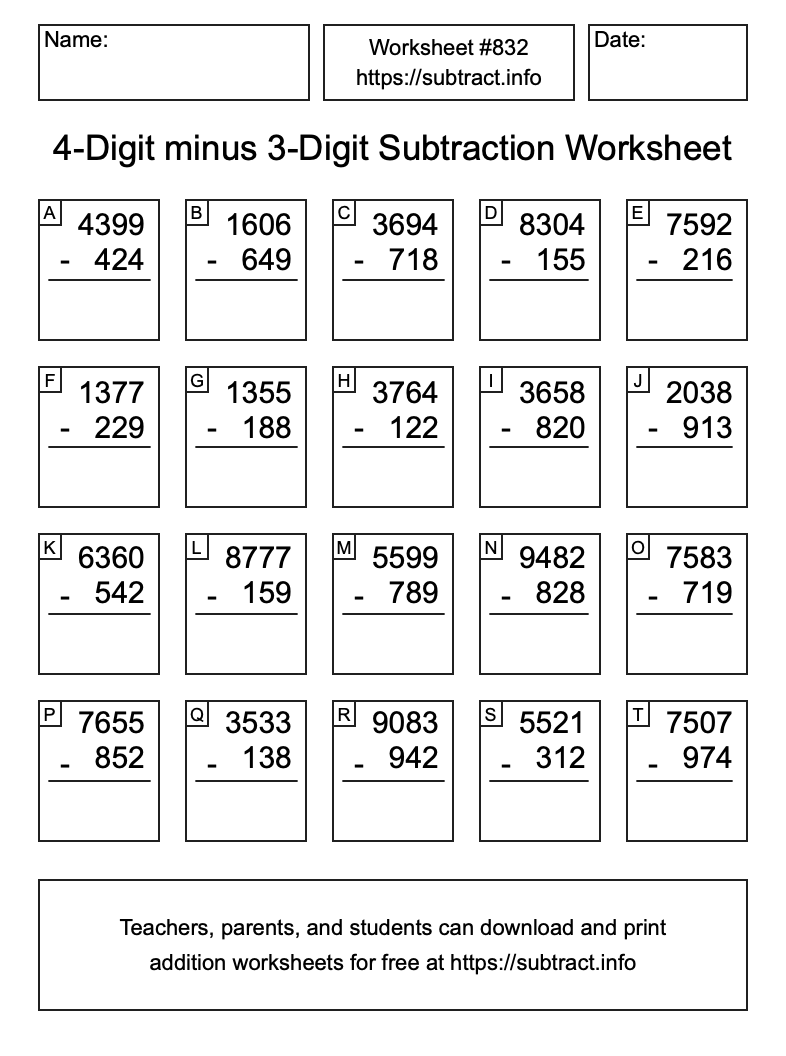 Here is the 4-Digit minus 3-Digit Subtraction Worksheet #832. Print and/or save the worksheet using the buttons below the image. You can also drag or right-click on the image to download it to your device.