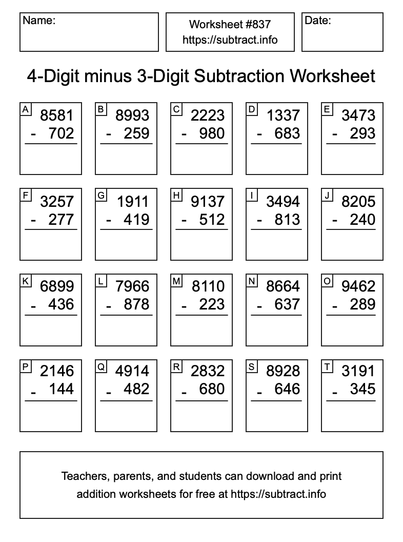 Here is the 4-Digit minus 3-Digit Subtraction Worksheet #837. Print and/or save the worksheet using the buttons below the image. You can also drag or right-click on the image to download it to your device.