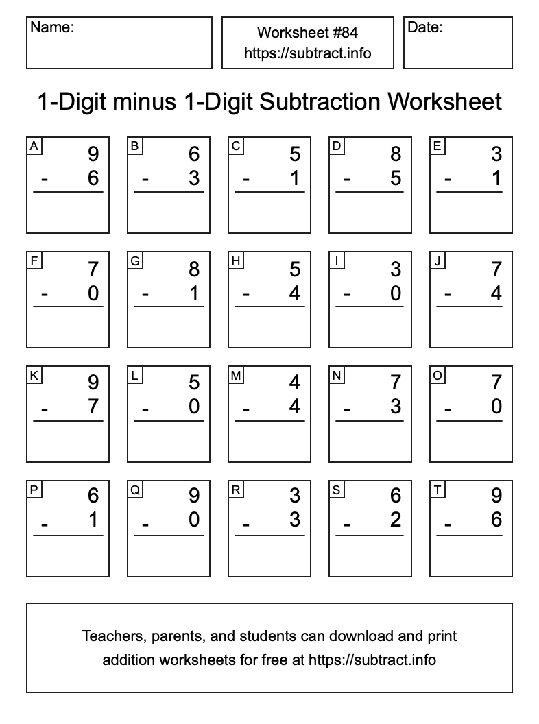 Here is the 1-Digit minus 1-Digit Subtraction Worksheet #84. Print and/or save the worksheet using the buttons below the image. You can also drag or right-click on the image to download it to your device.