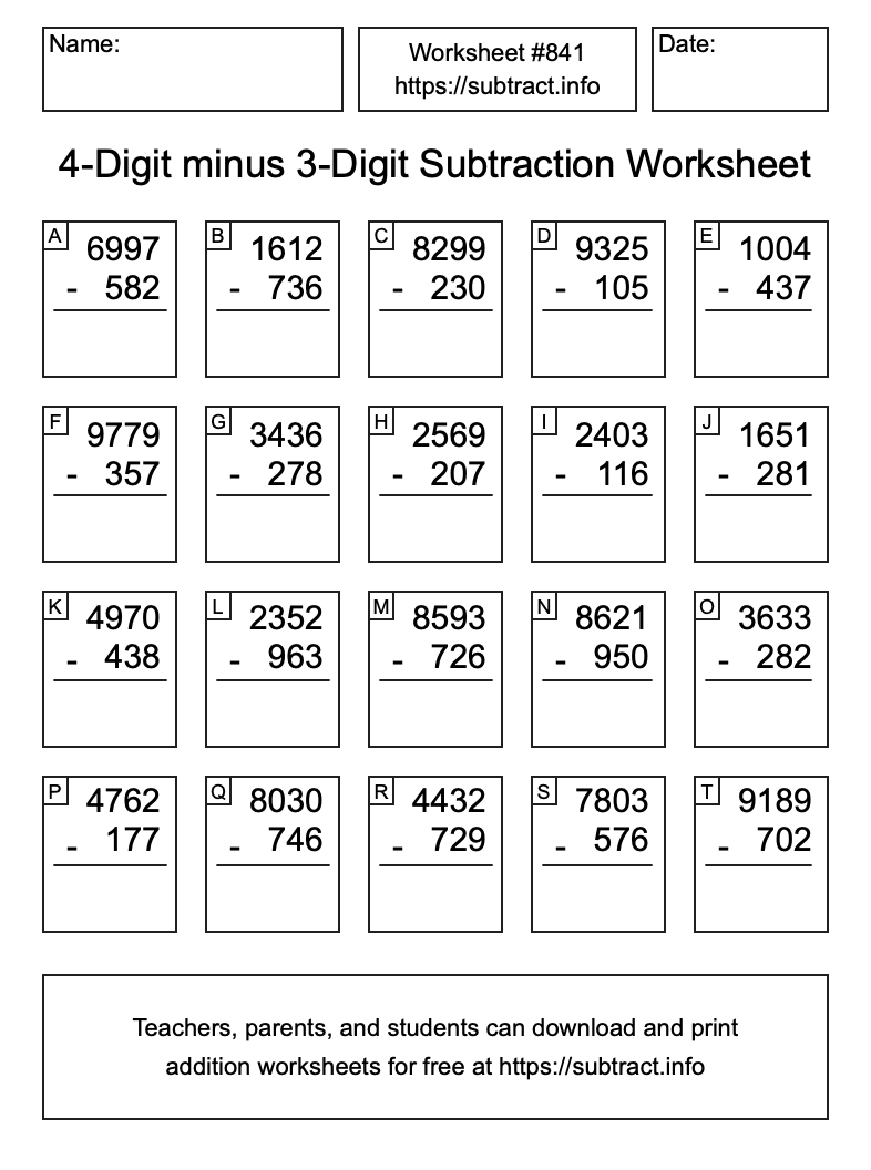 Here is the 4-Digit minus 3-Digit Subtraction Worksheet #841. Print and/or save the worksheet using the buttons below the image. You can also drag or right-click on the image to download it to your device.