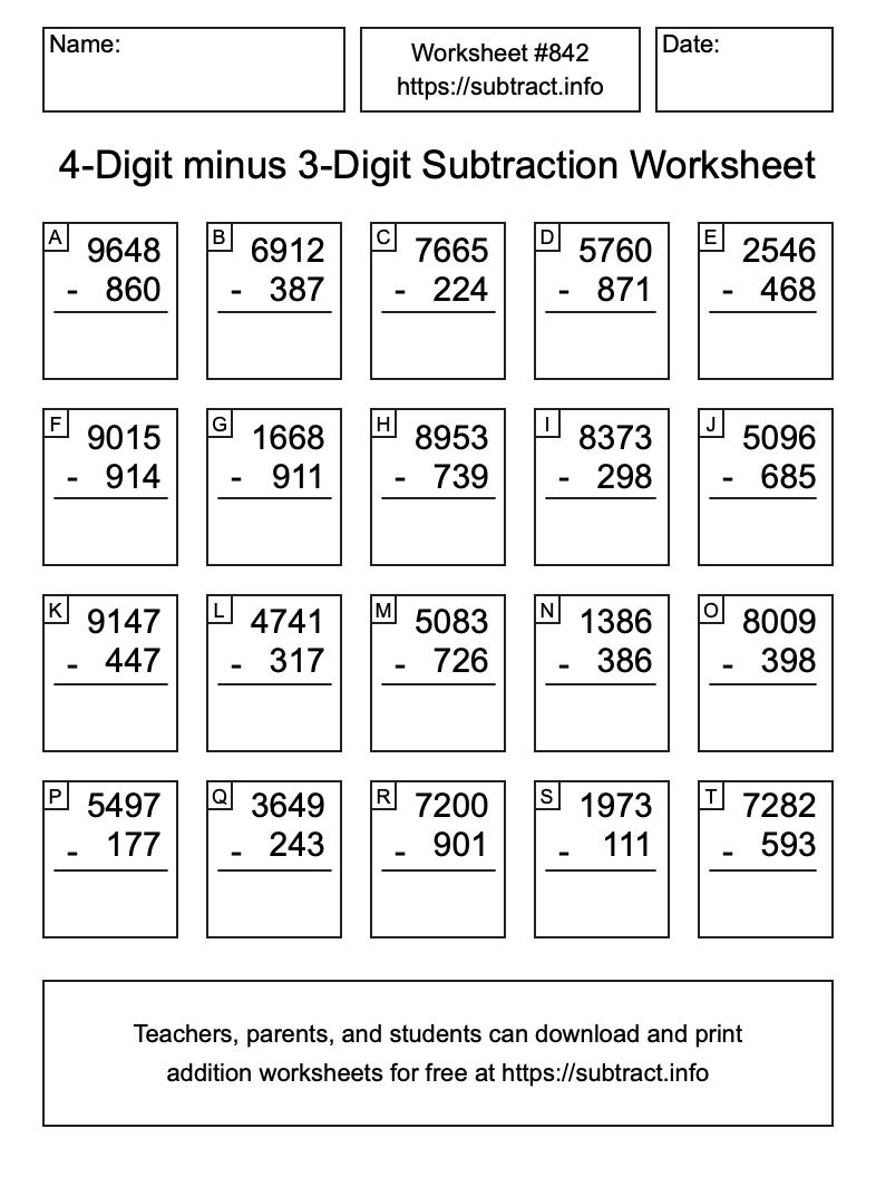 Here is the 4-Digit minus 3-Digit Subtraction Worksheet #842. Print and/or save the worksheet using the buttons below the image. You can also drag or right-click on the image to download it to your device.