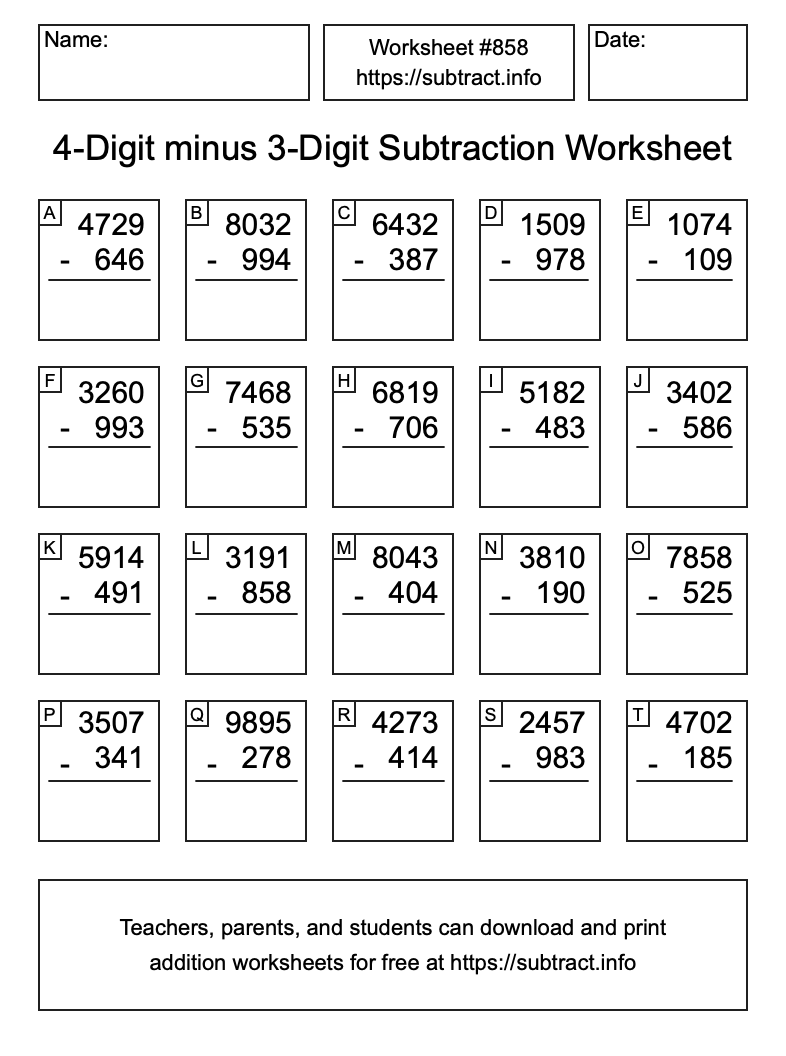 Here is the 4-Digit minus 3-Digit Subtraction Worksheet #858. Print and/or save the worksheet using the buttons below the image. You can also drag or right-click on the image to download it to your device.