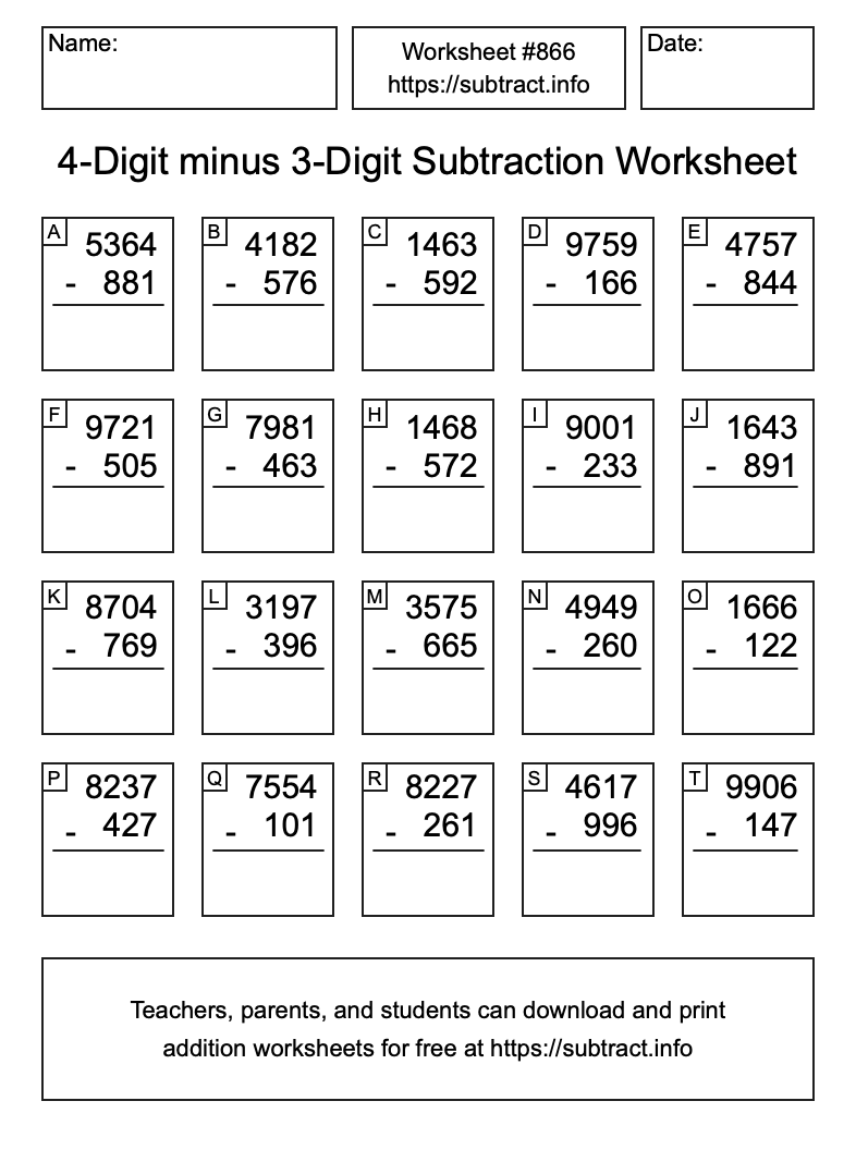 Here is the 4-Digit minus 3-Digit Subtraction Worksheet #866. Print and/or save the worksheet using the buttons below the image. You can also drag or right-click on the image to download it to your device.