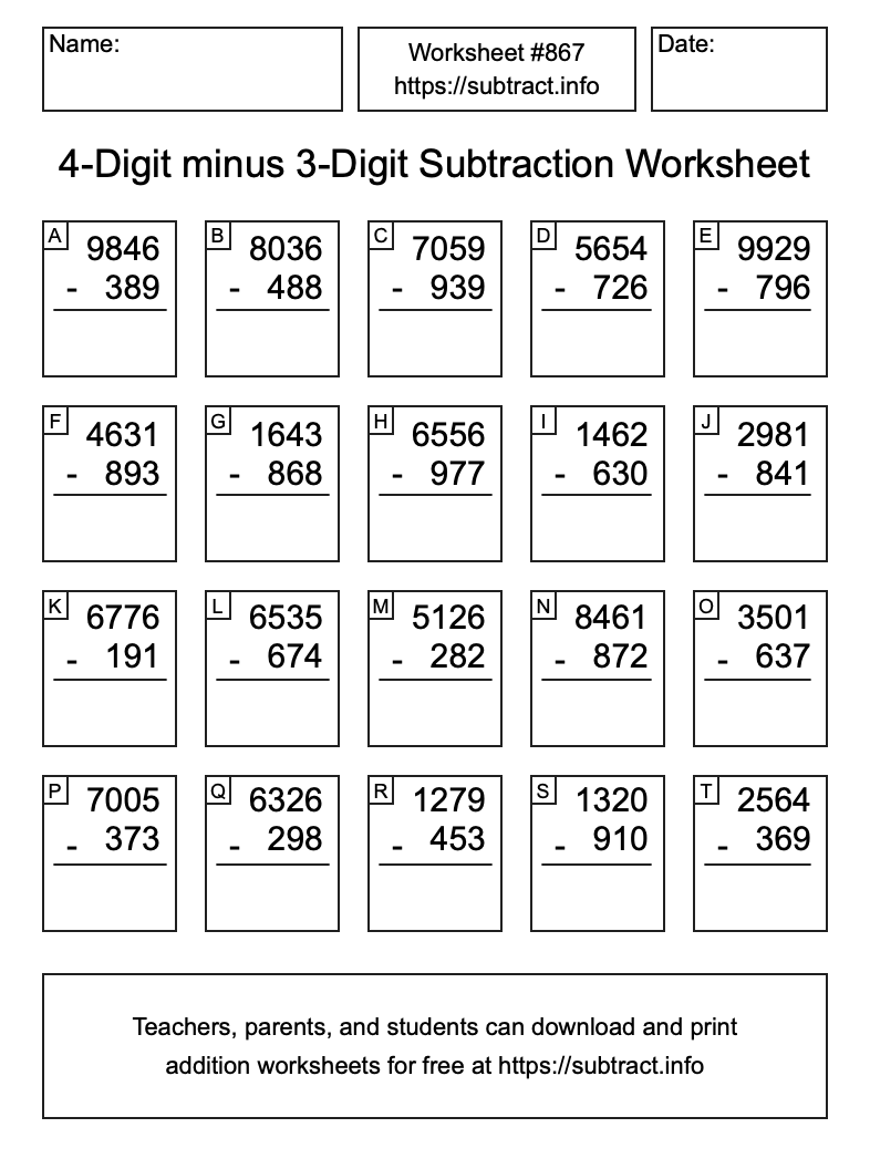 Here is the 4-Digit minus 3-Digit Subtraction Worksheet #867. Print and/or save the worksheet using the buttons below the image. You can also drag or right-click on the image to download it to your device.
