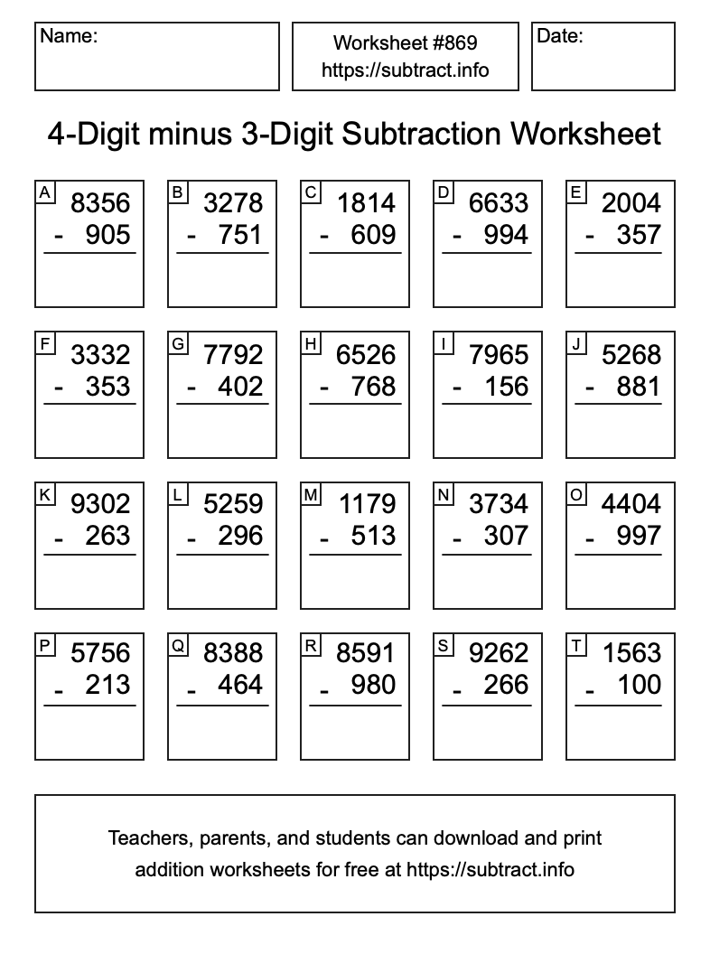 Here is the 4-Digit minus 3-Digit Subtraction Worksheet #869. Print and/or save the worksheet using the buttons below the image. You can also drag or right-click on the image to download it to your device.