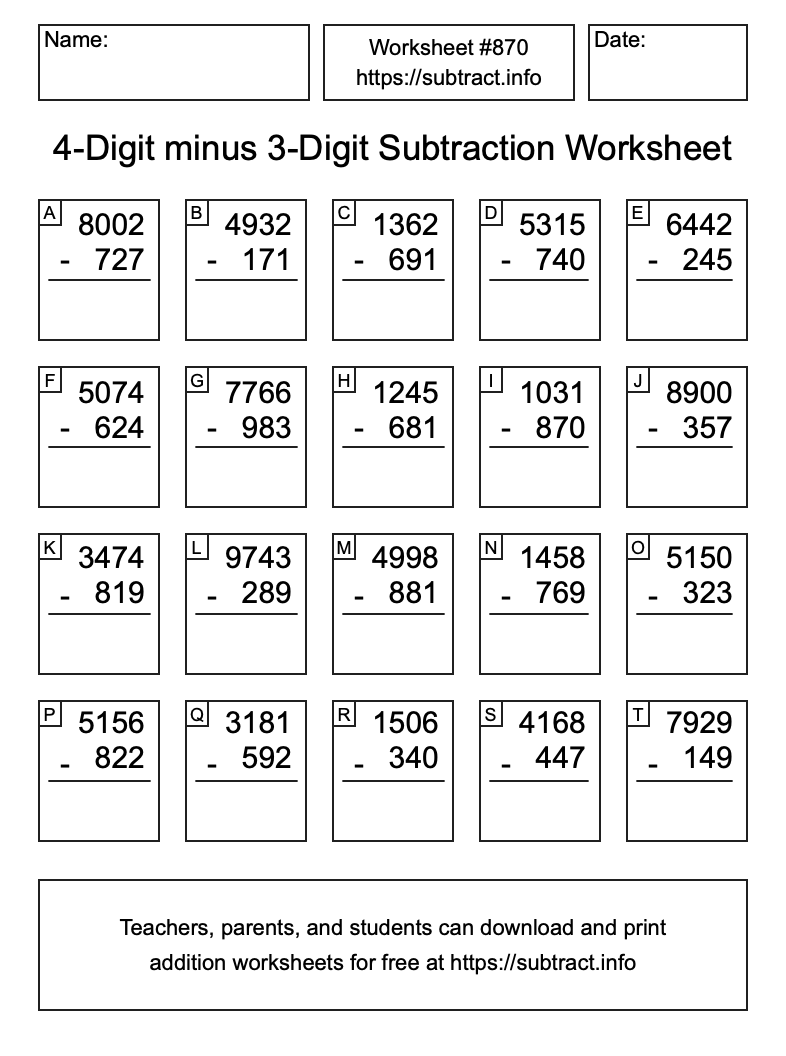 Here is the 4-Digit minus 3-Digit Subtraction Worksheet #870. Print and/or save the worksheet using the buttons below the image. You can also drag or right-click on the image to download it to your device.