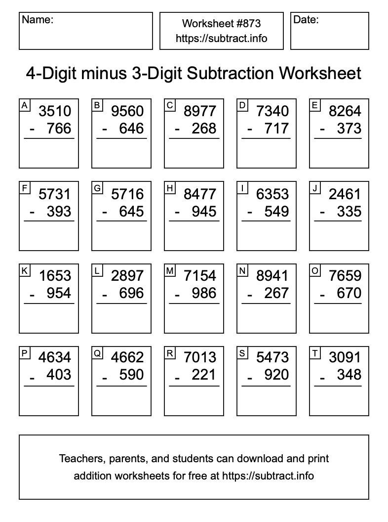 Here is the 4-Digit minus 3-Digit Subtraction Worksheet #873. Print and/or save the worksheet using the buttons below the image. You can also drag or right-click on the image to download it to your device.