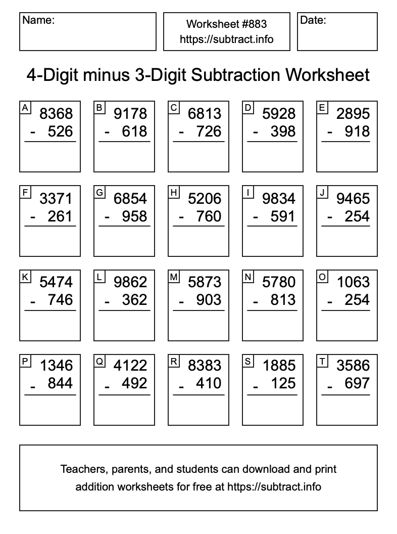 Here is the 4-Digit minus 3-Digit Subtraction Worksheet #883. Print and/or save the worksheet using the buttons below the image. You can also drag or right-click on the image to download it to your device.